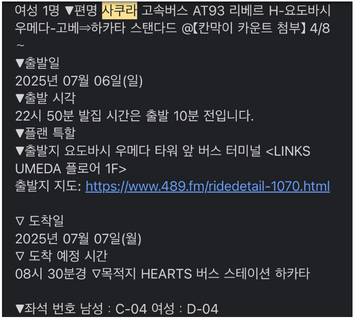 저는 사쿠라고속 (さくら高速バス)이라는 사이트에서 예약했습니다. 결제는 예약 약 일주일 전에 진행했고, 4열 좌석(지정석) 버스를 선택했습니다. 가격은 약 5,000엔대로 매우 합리적이었습니다.
